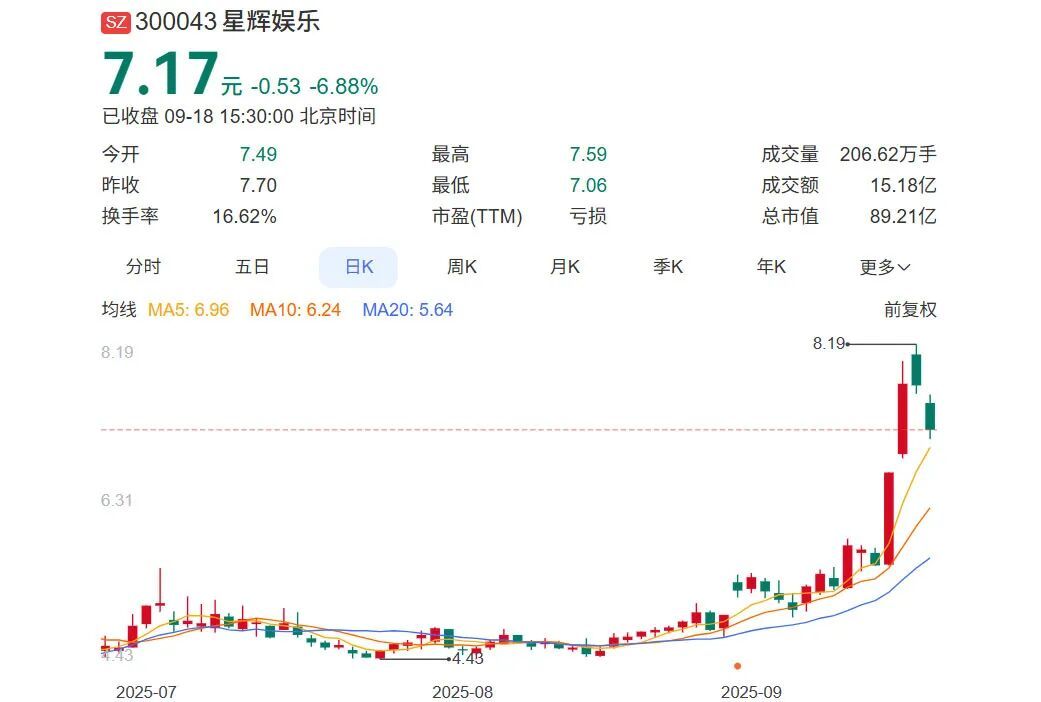 此事也点燃市场热情,星辉娱乐一度连日大涨,至18日,市值依然在90亿左右的高位。